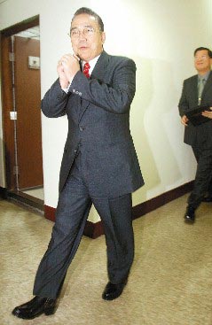 對媒體披露陳水扁當(dāng)局秘密成立鐽震公司進(jìn)行軍火買賣,臺當(dāng)局“國防部長”李天羽(左)在“立委”要求下,上午低調(diào)緊急赴“立法院”國民黨團(tuán)說明。臺灣《聯(lián)合晚報(bào)》記者林俊良攝