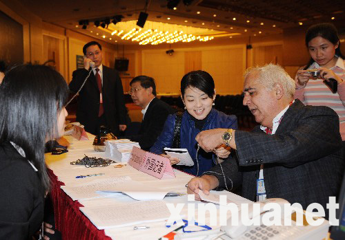 2月29日,一名外國通訊社記者(前右)在北京梅地亞中心的兩會新聞中心領(lǐng)取采訪證件。當(dāng)日,參加兩會報道的境內(nèi)外記者開始報到。新華社記者黃敬文攝