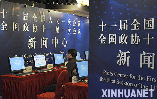 2月27日,新聞中心提供寬帶上網(wǎng)服務(wù)。 十一屆全國人大一次會議和全國政協(xié)十一屆一次會議將分別于3月5日和3月3日在北京開幕。記者獲悉,設(shè)在北京西長安街北側(cè)梅地亞中心的兩會新聞中心已于26日正式啟動,中心工作人員開始接待和安排中外記者采訪會議。 新華社記者 戴旭明攝