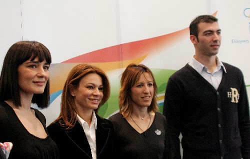 3月13日,北京奧運(yùn)會(huì)圣火采集儀式最高女祭司瑪利亞·娜芙普利都(左一)、儀式編導(dǎo)阿特密斯·伊格娜迪歐(左二)、第一火炬手亞歷山大·尼克拉澤斯(右一)、最后一名火炬手皮吉·德維茨出席希臘奧委會(huì)舉行的新聞發(fā)布會(huì)。按計(jì)劃,北京奧運(yùn)會(huì)圣火將于3月24日在奧林匹亞采集。 新華社記者梁業(yè)倩攝