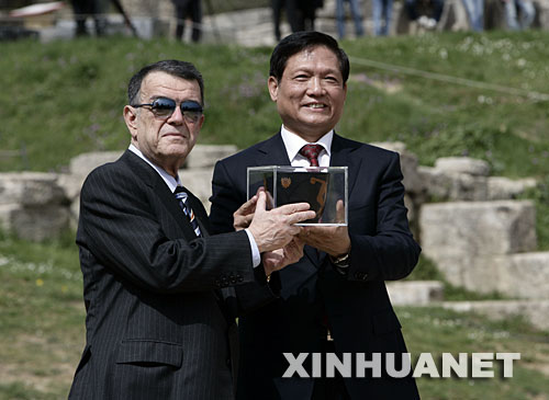 3月24日,希臘奧委會(huì)主席米諾斯·基里亞庫(kù)(左)在希臘古奧林匹亞遺址向中共中央政治局委員、中共北京市委書(shū)記、北京奧組委主席劉淇贈(zèng)送紀(jì)念品。當(dāng)日,北京奧運(yùn)圣火取火儀式在希臘古奧林匹亞遺址舉行。 新華社記者李岳攝