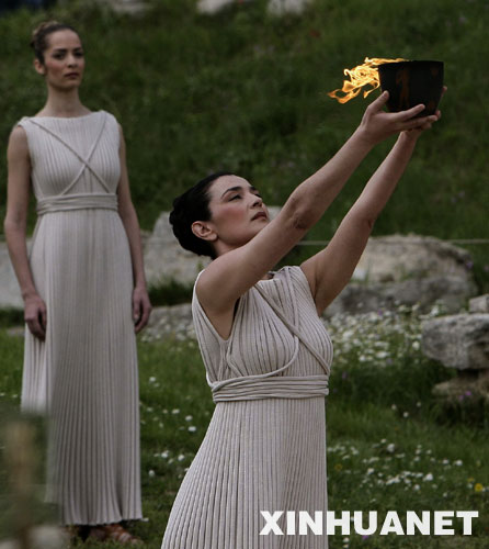 3月24日,北京奧運(yùn)會(huì)圣火取火儀式在希臘奧林匹亞舉行。圖為最高女祭司舉起火種罐。 新華社記者李岳攝