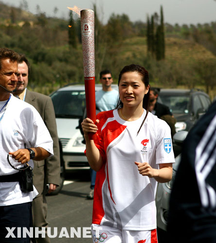 3月24日,中國(guó)火炬手羅雪娟(右)在火炬?zhèn)鬟f過(guò)程中。 新華社記者畢明明攝