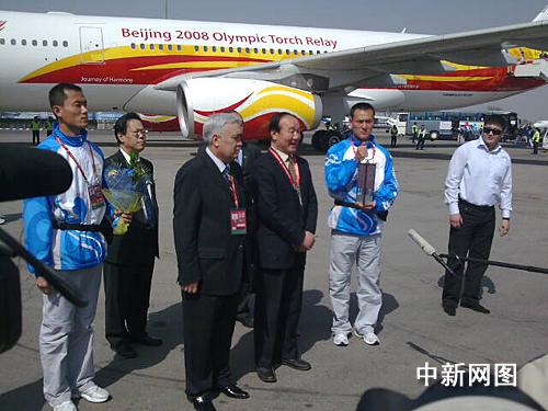 “和諧之旅”的首站之行非常順利,奧運包機比原定時間早一些到達阿拉木圖的機場。當?shù)販囟?6°C,天氣特別晴好。北京奧組委執(zhí)行副主席蔣效愚提著圣火燈走下舷梯,受到了前來迎接的阿拉木圖市和哈薩克斯坦奧委會代表,以及該市市民的熱烈歡迎。在展示圣火燈后,蔣效愚將其交給隨行的兩位圣火護衛(wèi)隊員。隨后,蔣效愚接受了當?shù)孛襟w采訪,表示很高興圣火來到阿拉木圖,希望能夠促進兩國的友好關(guān)系。