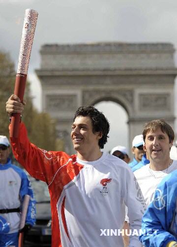 4月7日,奧運(yùn)火炬手在巴黎凱旋門前進(jìn)行傳遞。當(dāng)日,北京奧運(yùn)圣火傳遞活動在法國巴黎舉行。 新華社記者戚恒攝