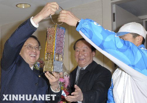 4月7日,中國駐美國大使周文重(左)接過火種燈。當(dāng)日,搭載北京奧運(yùn)會圣火的專機(jī)抵達(dá)美國舊金山。 新華社記者戚恒攝