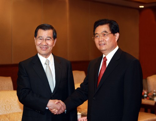 4月12日,中共中央總書記胡錦濤在海南省博鰲會見蕭萬長先生率領的臺灣兩岸共同市場基金會代表團一行。 新華社記者鞠鵬攝