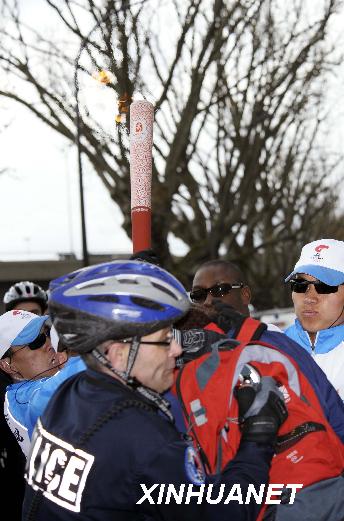 4月7日,北京奧運圣火在巴黎傳遞時遭遇少數(shù)“藏獨”分子的干擾破壞。這是巴黎警察及時制止一名擾亂火炬?zhèn)鬟f者試圖從火炬手手中搶奪火炬。 新華社記者戚恒攝