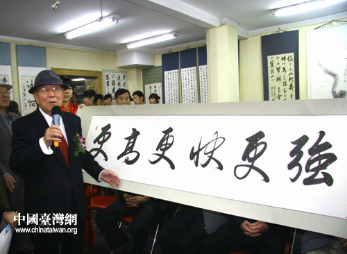 中國臺(tái)灣網(wǎng)5月8日北京消息 今天上午10點(diǎn),正值北京奧運(yùn)圣火首次登上地球之巔珠峰之際,當(dāng)代著名書法家張仲愈先生的迎奧運(yùn)書法匯報(bào)展在北京榮寶齋開幕。開幕式上,張仲愈先生向北京奧組委捐贈(zèng)大幅作品“同一個(gè)世界 同一個(gè)夢想”和一副六尺楹聯(lián) “奧運(yùn)雄風(fēng)健兒名揚(yáng)四海;中華盛世英雄功耀九州”;向國際奧委會(huì)主席羅格先生贈(zèng)送一副8尺橫幅作品“更快、更高、更強(qiáng)”。
