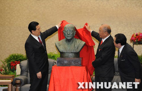 5月10日,國家主席胡錦濤在奈良會(huì)見日本奈良縣知事荒井正吾,并贈(zèng)送鑒真塑像。這是胡錦濤主席同荒井正吾為塑像揭幕。 新華社記者黃敬文攝