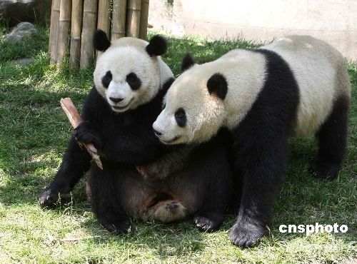 5月23日,準(zhǔn)備贈(zèng)送臺(tái)灣的大熊貓團(tuán)團(tuán)(右)和圓圓,在四川汶川大地震后的臥龍大熊貓保護(hù)區(qū)內(nèi)無(wú)憂無(wú)慮地戲耍。 中新社發(fā) 任晨鳴 攝