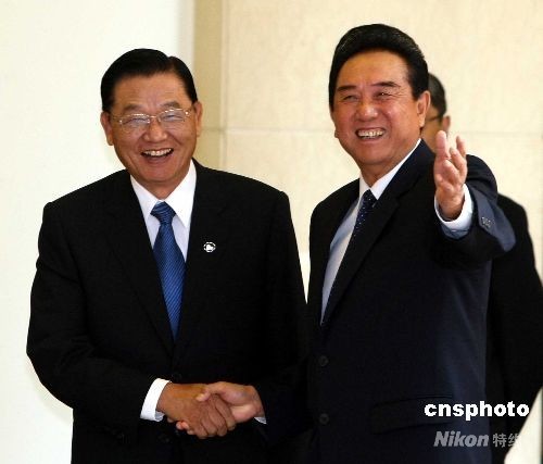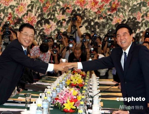 6月12日上午,海峽兩岸關(guān)系協(xié)會(huì)新任會(huì)長陳云林與臺(tái)灣海峽交流基金會(huì)董事長江丙坤在北京釣魚臺(tái)五號(hào)樓舉行會(huì)談。 中新社發(fā) 任晨鳴 攝