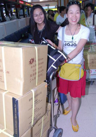 今天傍晚,搭乘東方航空南京—松山的蘇州首發(fā)團100多人,把松山機場代理地勤業(yè)務(wù)的立榮航空報到柜臺擠得水泄不通,幾乎每個人都有包裝好的大紙箱,塞滿了在臺灣購買的紀念品、拌手禮,托運回家。
