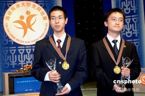 7月23日,來自臺灣的東吳大學(xué)代表隊選手張哲耀(左)、復(fù)旦大學(xué)代表隊選手方俊共同榮獲第七屆海峽兩岸大學(xué)生辯論賽最佳辯手獎。當(dāng)日,歷時3天的第七屆海峽兩岸大學(xué)生辯論賽在福州圓滿落幕。 中新社發(fā) 劉可耕 攝