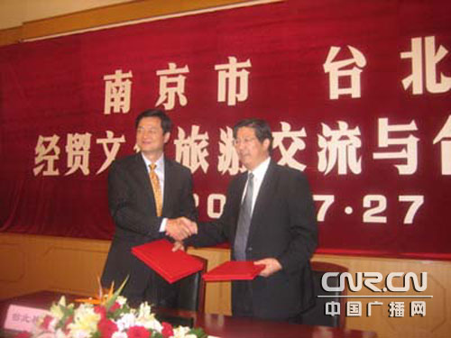 中廣網(wǎng)南京7月27日消息(記者姚東明)南京市今天上午與臺北縣簽署經(jīng)貿(mào)文化和旅游交流與合作關(guān)系備忘錄,這是兩岸城市間首次確立戰(zhàn)略合作框架,標(biāo)志著兩岸周末包機開通以后,兩岸交流合作水平進一步提升。
