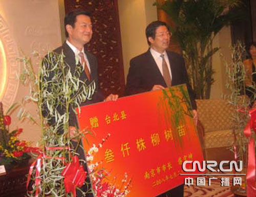 由臺北縣縣長周錫瑋先生率領(lǐng)的臺北縣南京參訪團是25日晚乘坐周末包機抵達南京的,參訪團先后拜謁了中山陵,參觀了南京城建館、總統(tǒng)府,并乘坐畫舫,游覽了夫子廟秦淮河風(fēng)光。南京市向臺北縣贈送了3000株柳樹苗、100株梅花、100株雪松。周錫瑋回贈南京市的是他自己親筆繪制的兩幅油畫作品。