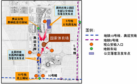 觀眾如乘坐地鐵線返回,一是步行至奧林匹克公園站乘坐8號(hào)線(奧運(yùn)支線)換乘地鐵10號(hào)線,或沿景觀大道向南步行至北土城站直接乘坐地鐵10號(hào)線;二是步行至東部公交場(chǎng)站乘坐開幕式公交專線至大屯路東站換乘地鐵5號(hào)線。在地鐵5號(hào)線天通苑站、天通苑北站、宋家莊站和10號(hào)線巴溝站、知春路站、勁松站,安排10條常規(guī)公交線路擺車接駁,方便觀眾換乘。開幕式彩排當(dāng)日,除機(jī)場(chǎng)線外,其它地鐵線路都會(huì)適當(dāng)延長(zhǎng)運(yùn)營(yíng)時(shí)間。