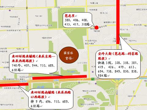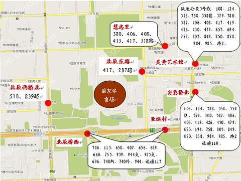 觀眾抵達(dá)奧林匹克公園區(qū)常規(guī)公交線路及車站分布圖