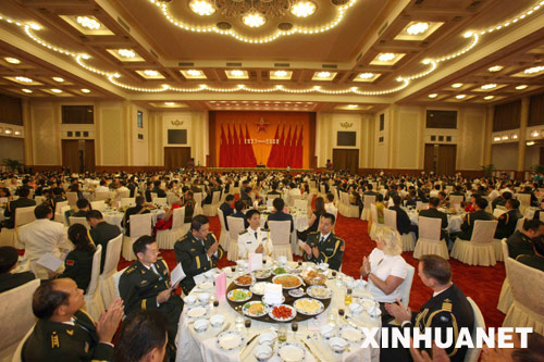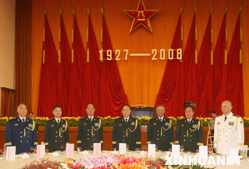 7月31日,中華人民共和國(guó)國(guó)防部在北京人民大會(huì)堂舉行盛大招待會(huì),熱烈慶祝中國(guó)人民解放軍建軍81周年。中央軍委委員、國(guó)務(wù)委員兼國(guó)防部長(zhǎng)梁光烈上將致祝酒辭。中央軍委委員、總參謀長(zhǎng)陳炳德上將,中央軍委委員、總政治部主任李繼耐上將,中央軍委委員、總后勤部部長(zhǎng)廖錫龍上將,中央軍委委員、第二炮兵司令員靖志遠(yuǎn)上將,中央軍委委員、海軍司令員吳勝利上將,中央軍委委員、空軍司令員許其亮上將出席招待會(huì)! 新華社記者 王建民攝