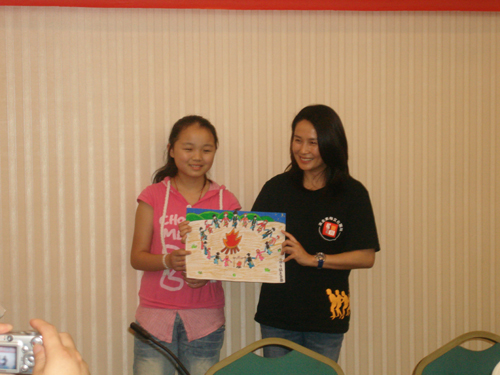 會上,受助學生代表張玉婷向高金素梅一行宣讀了感謝信。隨后,高金素梅女士與來自北川的20名受助羌族學生一一見面,并和學生家長進行交流。當了解到他們都失去了完整的家庭之后,高金素梅控制不住內(nèi)心的傷痛,與學生家長們相擁痛哭,并鼓勵他們要面對地震災害的殘酷現(xiàn)實,樹立信心,重建美好家園。