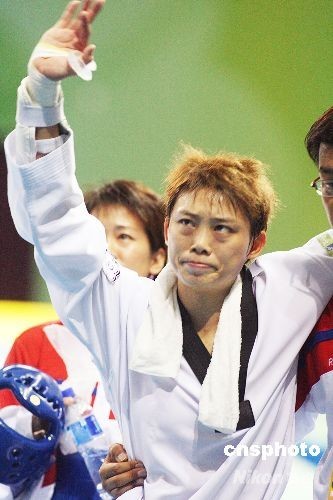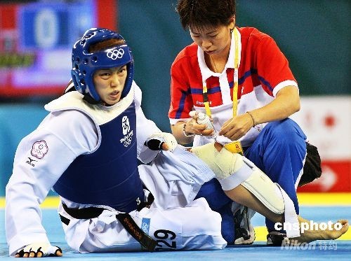 8月21日,在北京奧運(yùn)跆拳道女子57公斤級(jí)比賽中,中華臺(tái)北選手蘇麗文數(shù)次因膝蓋劇痛而倒地,但都忍下痛楚爬起繼續(xù)拼戰(zhàn),雖然最后落敗,但贏得全場(chǎng)的掌聲。 中新社發(fā) chinatimes 攝
