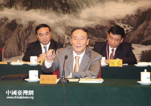 王岐山指出,今年以來(lái),臺(tái)灣局勢(shì)發(fā)生重大積極變化,擴(kuò)大和深化兩岸經(jīng)濟(jì)交流合作面臨難得的歷史機(jī)遇。兩岸在“九二共識(shí)”基礎(chǔ)上恢復(fù)協(xié)商,在“建立互信、擱置爭(zhēng)議、求同存異、共創(chuàng)雙贏(yíng)”的原則指引下,兩岸周末包機(jī)、大陸居民赴臺(tái)旅游順利實(shí)施。兩岸經(jīng)濟(jì)相互融合日益加深,經(jīng)濟(jì)交流合作不斷擴(kuò)大。兩岸同胞要抓住機(jī)遇,繼續(xù)加強(qiáng)經(jīng)濟(jì)文化交流,拓展合作領(lǐng)域,提高合作層次,盡快實(shí)現(xiàn)直接“三通”,促進(jìn)兩岸各領(lǐng)域交流合作邁上新臺(tái)階,推動(dòng)兩岸關(guān)系和平發(fā)展。