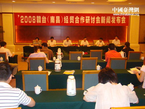 中國(guó)臺(tái)灣網(wǎng)9月2日消息 由國(guó)務(wù)院臺(tái)灣事務(wù)辦公室和江西省人民政府共同主辦的2008年贛臺(tái)經(jīng)貿(mào)合作研討會(huì)新聞發(fā)布會(huì)今日在南昌舉行!把杏憰(huì)”組委會(huì)有關(guān)負(fù)責(zé)人就會(huì)議的籌備情況、主要特點(diǎn)及贛臺(tái)經(jīng)貿(mào)合作情況作了介紹。此次“研討會(huì)”將于9月21日至26日在南昌舉辦,屆時(shí)將有1000余位臺(tái)灣客商和知名人士出席會(huì)議。
