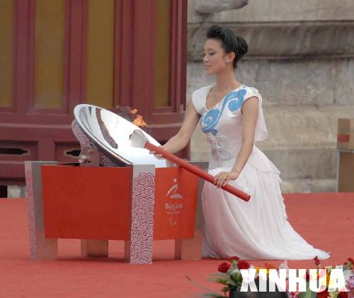 8月28日,北京殘奧會(huì)圣火采集暨火炬接力啟動(dòng)儀式在北京天壇祈年殿南廣場(chǎng)舉行。這是圣火采集使者姜馨田引燃引火棒。 新華社記者徐亮攝