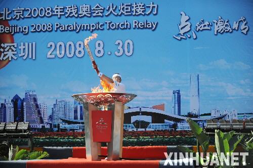 8月30日,最后一棒火炬手沈建平點(diǎn)燃圣火盆后展示火炬。當(dāng)日,北京殘奧會(huì)圣火在深圳進(jìn)行傳遞。 新華社記者楊光攝