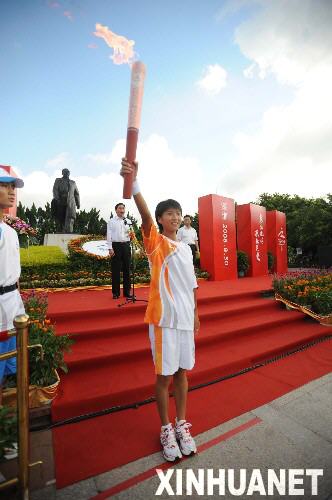 8月30日,第一棒火炬手劉虹在起跑儀式上展示火炬。當(dāng)日,北京殘奧會(huì)圣火在深圳進(jìn)行傳遞。 新華社記者楊光攝