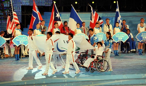 9月7日,在啟動儀式上,執(zhí)旗手手持國際殘奧委會會旗入場。 新華社記者 范長國 攝