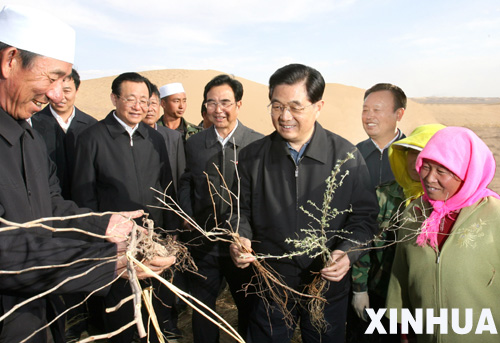資料圖片 2007年4月11日至14日,中共中央總書記、國家主席、中央軍委主席胡錦濤到寧夏回族自治區(qū)考察工作。這是胡錦濤在毛烏素沙漠邊緣的白芨灘林場大泉治沙實(shí)驗(yàn)區(qū)同當(dāng)?shù)馗刹咳罕娪H切交談,仔細(xì)了解防沙治沙工作情況。 新華社記者鞠鵬攝