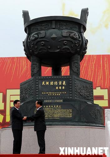 新華網(wǎng)銀川9月22日電(記者李志昂、齊中熙)22日下午,寧夏博物館寶鼎廣場(chǎng)彩旗招展,鼓樂(lè)喧天。由胡錦濤總書記親筆題寫鼎名的“民族團(tuán)結(jié)寶鼎”贈(zèng)鼎儀式在這里隆重舉行。中共中央政治局常委、中央紀(jì)委書記、中央代表團(tuán)團(tuán)長(zhǎng)賀國(guó)強(qiáng)和寧夏回族自治區(qū)黨委書記陳建國(guó)一起拉動(dòng)大紅綢布,為中央人民政府贈(zèng)送寧夏回族自治區(qū)的寶鼎揭幕。