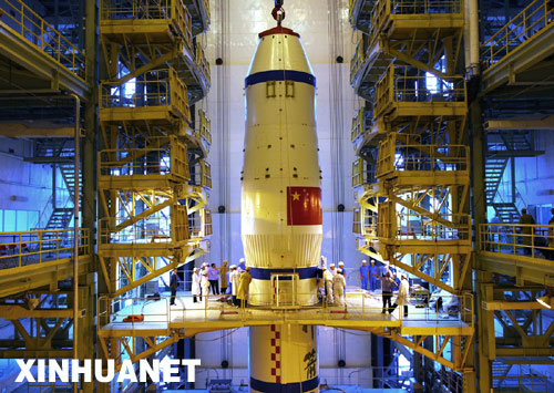 近日,神舟七號(hào)飛船完成與長(zhǎng)征二號(hào)F運(yùn)載火箭的對(duì)接。這是神舟七號(hào)飛船與長(zhǎng)征二號(hào)F運(yùn)載火箭在垂直裝配廠房進(jìn)行對(duì)接。新華社發(fā)(秦憲安 攝)