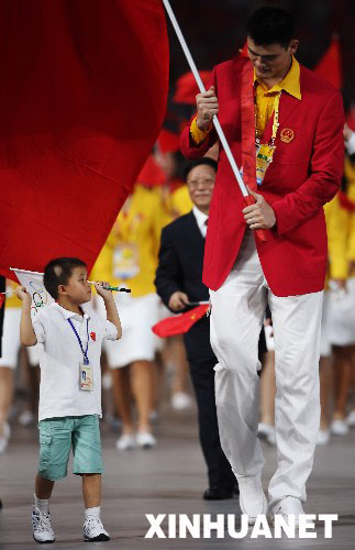 這是8月8日,中國(guó)代表團(tuán)旗手姚明和九歲半的抗震救災(zāi)小英雄林浩一起入場(chǎng)。當(dāng)晚8時(shí),第29屆夏季奧林匹克運(yùn)動(dòng)會(huì)在國(guó)家體育場(chǎng)——“鳥(niǎo)巢”隆重開(kāi)幕。 新華社發(fā)(資料照片)
