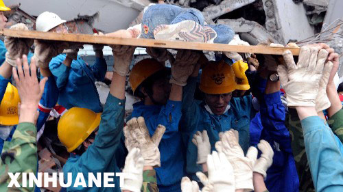 這是5月13日,在四川綿竹市漢旺鎮(zhèn)一所中學(xué)內(nèi),救援人員經(jīng)過(guò)十幾小時(shí)的艱苦努力,終于從廢墟中救出一位女學(xué)生。新華社發(fā)(資料照片)