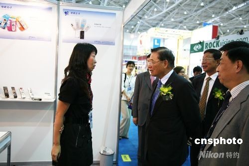 十月七日,二00八年海峽兩岸電子展在臺北世貿(mào)中心南港展覽館舉行,“;鶗倍麻L江丙坤出席開幕典禮,對大陸企業(yè)來臺參展表示歡迎,希望兩岸經(jīng)貿(mào)合作更加緊密,期待大陸人員今后來臺不必繞道。來自大陸的一百五十余家企業(yè)、經(jīng)貿(mào)團體分參展團與觀展團參加此次電子展,臺灣參展企業(yè)達千余家。大陸與臺灣參展企業(yè)數(shù)與參展人數(shù)均創(chuàng)歷年之最。 中新社發(fā) 楊旭 攝