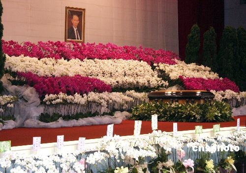 臺(tái)塑企業(yè)創(chuàng)辦人王永慶的遺體十七日由長榮班機(jī)運(yùn)抵臺(tái)灣,靈堂設(shè)在桃園縣的長庚大學(xué)活動(dòng)中心。圖為棺木安放在靈堂內(nèi)景。 中新社發(fā) 耿軍 攝