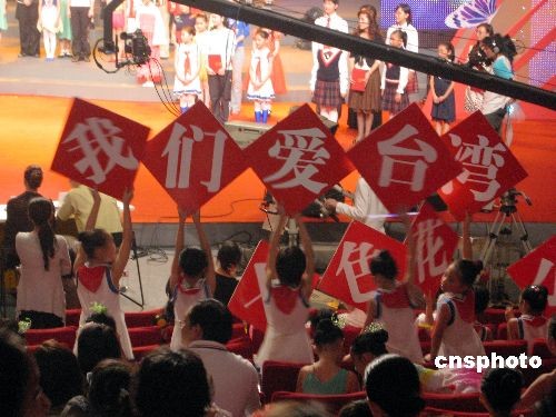 10月18日晚,上海首次舉辦“我愛臺灣”中小學(xué)生歌舞大賽。比賽由上海市臺辦、浦江之聲廣播電臺等聯(lián)合舉辦。在大賽現(xiàn)場,由兩岸小演員組成的上海七色花小學(xué)參賽隊(duì)自發(fā)打出“我們愛臺灣”的標(biāo)語。據(jù)了解,上海有超過六千名注冊在讀的臺灣籍學(xué)子,他們中的一部分也參加了這一歌舞大賽。 中新社發(fā) 許曉青 攝