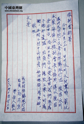 曾于今年五月被困四川汶川地震災(zāi)區(qū)的臺灣彰化縣鄉(xiāng)親發(fā)給張銘清的慰問信。信中說:四川汶川大地震時(shí),彰化溪州成功村村民參加祥鶴旅行團(tuán),被困汶川,承蒙海協(xié)會張副會長之協(xié)助,得以脫困,安全回臺。您近日來臺反受委屈。我們深感不舍與遺憾……(詳全文)(來源:中國臺灣網(wǎng) 田云鵬攝)