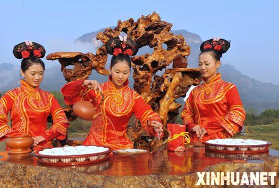 11月16日,三位姑娘在風(fēng)光秀麗的武夷山大王峰下表演茶藝。 當(dāng)日,第二屆海峽兩岸茶業(yè)博覽會(huì)在福建武夷山拉開帷幕。海峽兩岸6000多名茶商、茶農(nóng)以及茶業(yè)專家相聚武夷山下,以茶會(huì)友,共敘親情,以一脈相承的茶文化為橋梁和紐帶,拓寬旅游、經(jīng)濟(jì)等領(lǐng)域的廣泛合作,推動(dòng)兩岸經(jīng)濟(jì)文化繁榮。 新華社記者張國俊攝