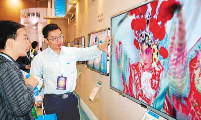 在2008中國蘇州電子信息博覽會上,一名工作人員向參觀者介紹超薄新款電視機。朱桂根攝(新華社發(fā))