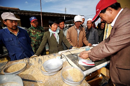 農(nóng)民在寧夏石嘴山市平羅縣通伏鄉(xiāng)米業(yè)協(xié)會(huì)銷售稻谷(10月15日攝)。近日,寧夏水稻喜獲豐收,一些地區(qū)成立的米業(yè)合作社,讓農(nóng)民賣糧難、兌付難的問題基本得到解決。寧夏石嘴山市平羅縣各米業(yè)協(xié)會(huì)旗下的大米加工企業(yè)與米業(yè)合作社互通信息,采取現(xiàn)金收糧的方式,提高農(nóng)民賣糧的積極性。新華社記者 馬俊 攝