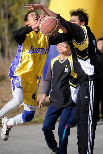 12月5日,南京市高淳一隊(duì)球員(左)在比賽中帶球突破。當(dāng)日,南京市“建設(shè)新農(nóng)村”農(nóng)民男子籃球賽分別在南京市高淳縣古柏鎮(zhèn)武家嘴村和淳溪鎮(zhèn)戴村新建的“新農(nóng)村體育健身工程”籃球場(chǎng)舉行,共有來自南京市7個(gè)區(qū)縣的8支農(nóng)民籃球隊(duì)參加了本次比賽。新華社記者韓瑜慶攝