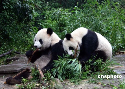 資料圖: 兩只贈臺大熊貓“團團”和“圓圓”,圖為“圓圓”正在吃從“團團”手中搶來的竹筍。 中新社發(fā) 黃永莉 攝