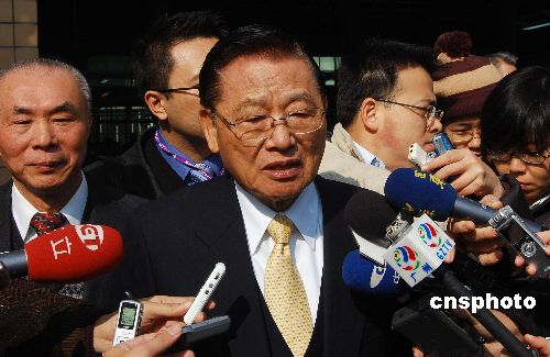 一月九日上午,海協(xié)會(huì)與;鶗(huì)聯(lián)合參訪團(tuán)在廣州考察一家臺(tái)資企業(yè)?疾旖Y(jié)束后,臺(tái)灣;鶗(huì)董事長江丙坤接受兩岸記者聯(lián)合采訪。 中新社發(fā) 柯小軍 攝