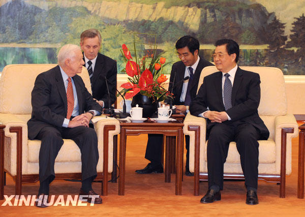 1月12日,國家主席胡錦濤在北京人民大會堂會見來華出席中美建交30周年紀念活動的美國前總統(tǒng)卡特。 新華社記者劉建生攝