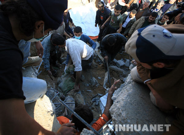 1月18日,在加沙城東部,巴勒斯坦人從廢墟中挖出一名遇難兒童的遺體。以色列總理奧爾默特當(dāng)日說(shuō),盡管以方已在加沙地帶實(shí)施單邊;,但如果巴勒斯坦有關(guān)武裝派別不停止火箭彈襲擊,以方有權(quán)重新展開軍事行動(dòng)。新華社記者納賽爾攝