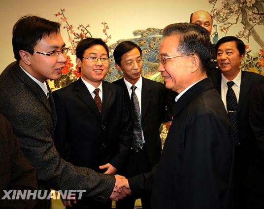 這是2月12日,溫家寶與參加座談會的基層群眾代表親切握手。新華社記者劉建生攝
