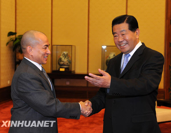 賈慶林歡迎西哈莫尼來華,高度評價柬埔寨王室對中柬關(guān)系發(fā)展作出的卓越貢獻。